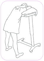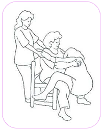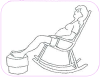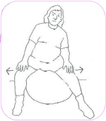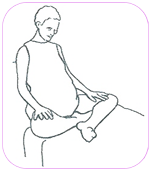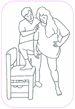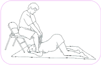 Standing lunge:Standing beside a chair and facing forward, the mother places one foot on the chair seat, with her raised knee and foot turned out. Bending her raised knee and hip, she "lunges" sideways repeatedly during a contraction (either in the direction that is more comfortable, or to the right for two or three contractions, and then to the left). She holds the stretch for two to five seconds at a time. She should feel the stretch in her inner thighs. Secure the chair, and help her keep her balance. |