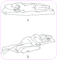 Side-lying or semiprone:In the side-lying position, the mother lies on her side with both knees flexed and a pillow between them (a). In the semiprone position, she straightens her lower leg, rolls slightly toward her front, flexes her top hip and knee, and rests the top knee on one or two pillows (b). During the birthing stage, you can hold the mother's top leg up as she pushes (c).