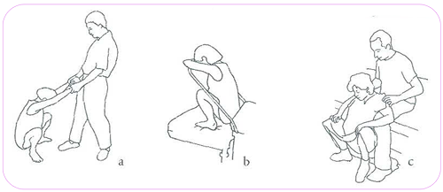 Squatting:The mother squats on the floor or bed, holding onto your hands (a), a railing, or a squatting bar (b) attached to the bed. Or, if you sit with your feet spread, she may stand between your knees (facing away from you) and lower herself into a squat, with her arms resting on your thighs for support (c). |