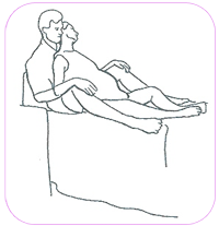Dangle:Sit on the edge of a high bed or counter, with each foot supported on a chair and your thighs spread. Standing, the mother backs between your legs and places her flexed arms over your thighs. During contractions she lowers herself. Grip her chest with your thighs as she lowers. You support her full weight. Between contractions, she stands. |