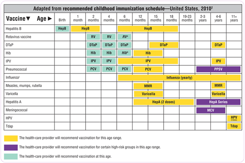 immunization schedules for persons aged 0 through 18 years - United States, 2010. MMWR. 2010;58(51&52):1-4. 3. CDC. Recommended adult immunization schedule - United States, 2010. MMWR. 2010;59(1):1-4.